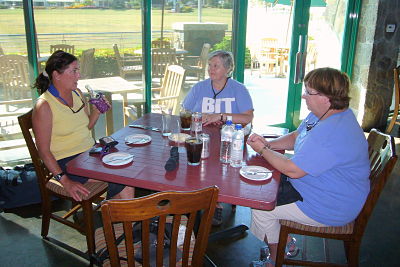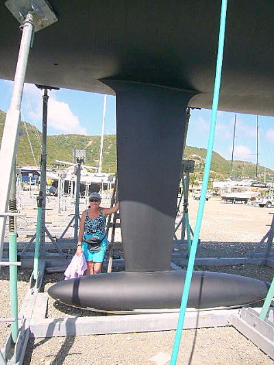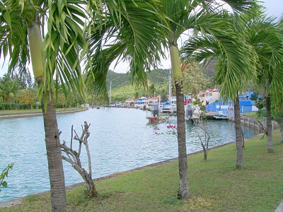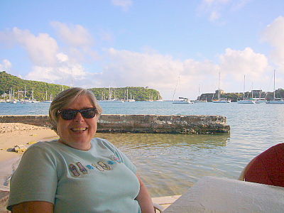 2 February. 82F. Everyone slept in; no surprise given local time is one hour ahead of ours. After breakfast, Kathy and I took the golf cart, roamed around the complex and checked out the beach (very nice beach indeed). We also stopped at Horizon and introduced ourselves to Jackie before going over to the boatyard to explore. The yard was well equipped; many boats were held in place with hurricane straps. Most were in various states of refit; I was surprised to see many still had canvas while on the hard. In the afternoon, Cathy, Kathy and I took the local bus to St. John's. Wandered the main street, checked out the cruise ship terminal, watched some of the cruisers debark from the local tour boats. Apparently, the only thing served on these day boats was rum punch. One poor lady was being carried off as we strolled by. Oh well. Picked up some fresh vegetables at the big market across from the bus depot. Dinner at Al Porto again; much less crowded, nice table along the water, pizza and calamari for our last night ashore.