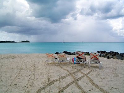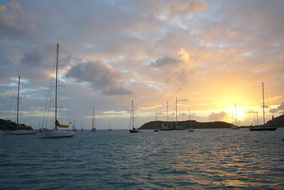 Aboard the 2010 Bavaria Cruising 40, Tardis; a disappointment - real chart plotter was not installed at either of the dual helms, just a small Garmin unit at the navigation station below. Given that these cruising grounds have often shallow waters, this was very surprising. Fortunately, I had my own Garmin GPSMAP76Cx loaded with the southeast Caribbean Bluechart G2 data. Eugene reviewed all of the boat systems with us and re-installed the dodger (which had been taken off for a minor repair). Finally, a Zodiac from another boat was brought over. After one more run for tonic water and beer, headed for Dickenson Bay. Motor-sailed northwards in 20 knots of wind with gusts to 25. Seas were ~10 feet (6-8 second period). Dickenson Bay provided a reasonable anchorage. Following Al's suggestion, dropped the hook about 100 yards off the beach with 5 feet under the keel. Sandals resorts has a huge resort complex ashore. Finally, Happy Hour onboard. Enjoyed Sheila's grilled marinated chicken, and the sunset over Montserrat to the southwest. Green track