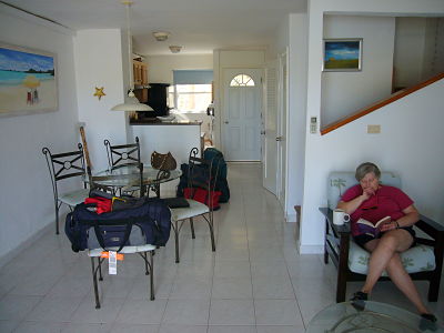1 February. 84F. Winter here in central Massachusetts has been miserable; over 50 inches of snow so far and more coming. Sheila and I left the house at 3:30 AM (20F) for a 5:30 flight to Miami. Met up with Cathy and Kathy at Logan. Delighted to get out just ahead of two more storms today. Flights in the Northeast were being cancelled due to equipment not arriving! Very easy connection to Antigua_2011 via Miami. Unlike years past, we decided to spend the first few days ashore and wind down to island time. Jackie at Horizon Yacht Charters put us in touch with Johanna who manages several villas at the Jolly Harbor Resort complex. It is a very big place, set behind a guarded main gate, a few shops, a huge marina, Epicurean (a nicely stocked grocery) as well as several restaurants. Perfect! The villa complex was exactly what we wanted; clean, nice views, and a quick golf cart ride to the conveniences. No wonder folks (mostly Brits) have places here; easy, slow, nice views, flip-flops, beach, and a cold drink. Stayed in a two bedroom unit; living area on the first floor, a small kitchen, patio, and even a dock. Too bad we didn't bring a boat. After a run for some groceries and liquid refreshments, dinner at Al Porto. The place has an impressive wood burning oven for pizza. Did I say that today was 2 for 1 pizza night! The place chaos, but the food was great; pepperoni and eggplant pizzas really hit the spot. One of the nice things about Antigua_2011 at this time of year is that the nights are just warm (70'ish F). The tired crew slept very well and dreamed about a day ashore in the AM.