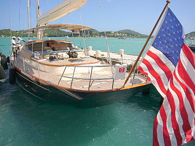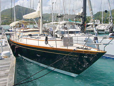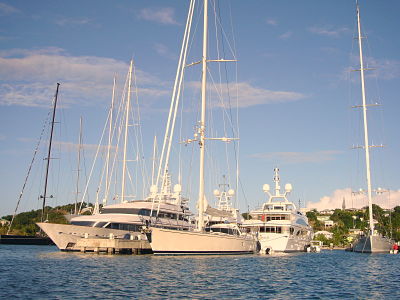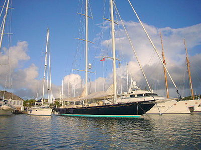 8 February. 80F. Wind abating? Topped off fuel and water; hoped to make Merton's Harbor, not far beyond English Harbor. Just beyond the Goat Head Channel, ran into gusts of 30 knots and 18 foot seas; several waves washed over bow. Here's a brief video clip of that ride. Headed into Falmouth Harbor and picked up the same mooring ball as before. Winds still 20-25 so wet ride to the other side of the harbor in the inflatable. More big boats; including, would you believe it, our very own Senator Kerry's 72 foot custom mono hull Isabel! The crew were re-doing her bright work. Obviously, Antigua has a favorable tax rate on boat repair. Roamed around the adjacent boatyard and decided on a large maxi for our next charter (see picture below). Finally, a Ting at the bar. Steak and BBQ chicken on Tardis. Bouncy overnight with the wind up. Orange track