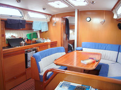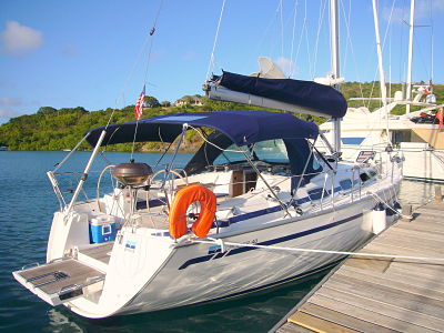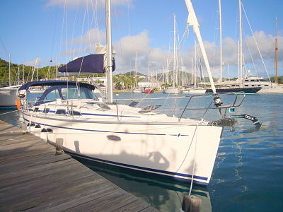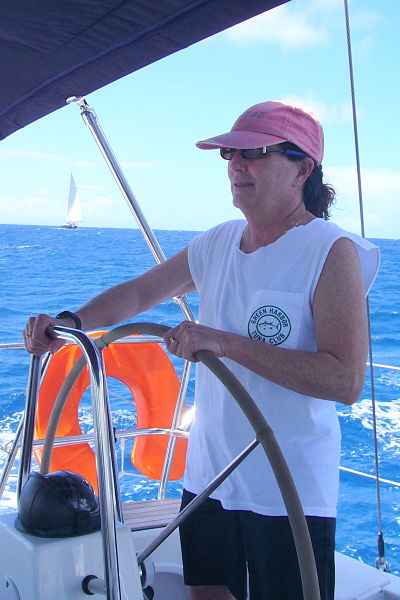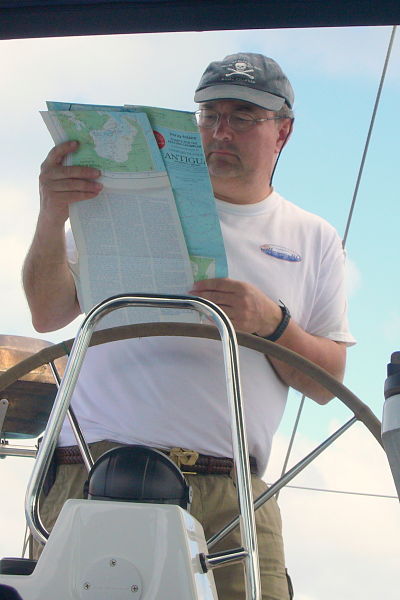 3 February. 84F. Charter does not start until noon, so in no rush. Leisurely breakfast, packed up. Kathy and I headed for the boat while Sheila and Cathy made a grocery store run. The folks at Horizons were not quite ready for us; the provisions we just going aboard (Sheila helped to verify what we had). What, no dodger on the boat and no inflatable/outboard ready! Jackie and Al didn't seem to understand why we were eager to get going! They obviously needed to spend some time in a Boston winter. After frustrating delays, Kathy and I sat with Al for a chart briefing. He did a very thorough job, and explained which areas of Antigua were not safe to navigate. Unlike the BVI, Antigua is surrounded by numerous reefs. Much of close-in sailing is done in fairly shallow water! Considering our expressed interest to go north to Barbuda, we also discussed weather forecast. Unfortunately, the outlook was less than ideal. Typical conditions for the next week were 20+ knots from the E or ENE with seas 12-15 feet. Oh good.